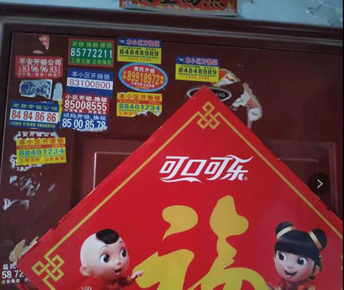 ①工商新村小区门上长满“牛皮癣”。