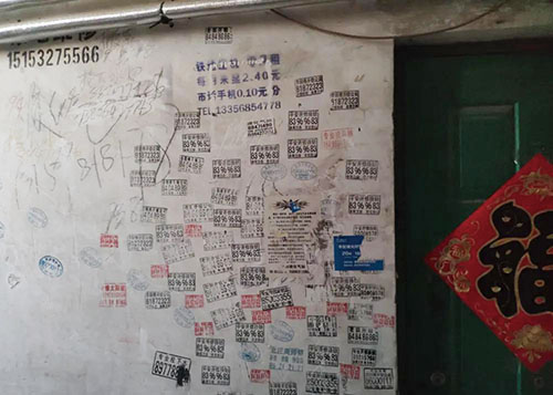 ②岚上公寓墙上满是广告。