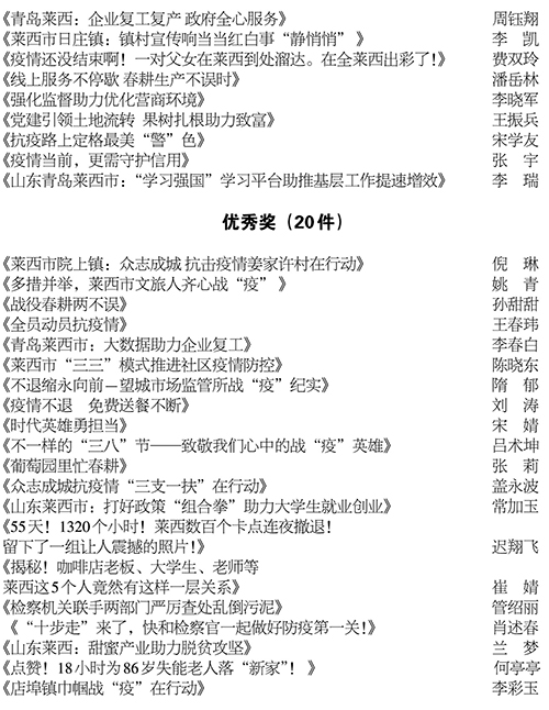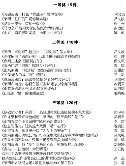 莱西市2020年度“万福杯”好新闻第一季度获奖作品名单