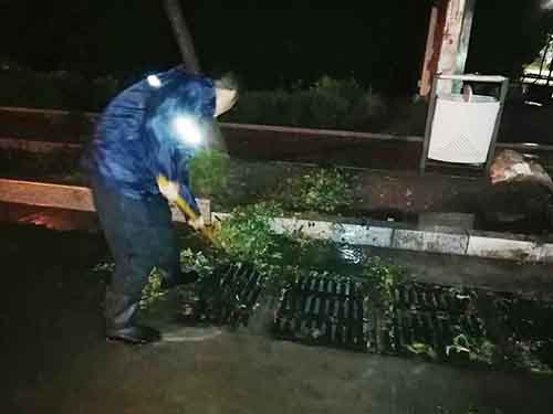 5月17日21时,城区突降大雨,市住建局各科处、中心立即启动防汛应急工作,全局200余名抢险队员迅速自带工具到达城区20多个防汛重点区域。负责泄洪闸门人员第一时间奔赴洙河、月湖岸边,查看闸门处水位;全体防汛队员分散到各自分工负责的重点路段,打捞排水口漂浮物,打通排水渠道,排除路面积水;对全城区范围道路积水情况进行排查,根据局部积水情况现场调度人员、车辆,布设警示架、警示带,对积水较重区域进行交通管制,引导车辆行人安全通过。