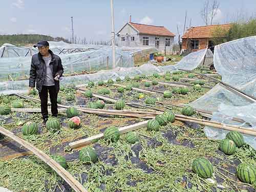 5月18日,记者跟随河头店镇政府工作人员到村庄、地头查看农民受灾情况。据了解,全镇共有小麦33041亩损毁、倒伏,苹果2307亩、梨5957亩落果,西瓜、甜瓜680亩受损,大棚薄膜8449亩破损,9000多间房屋瓦片、玻璃受损,水马路、北岚路口两侧树木、电线杆多处折断倾斜。