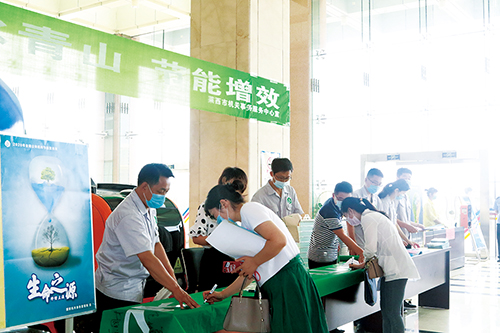 7月2日是全国低碳日。为营造浓厚节能降耗氛围,当天,市机关事务服务中心在行政办公中心一楼大厅组织开展了以“绿水青山,节能增效”为主题的节能宣传周系列活动,800多名干部职工签名承诺“节能有我”。