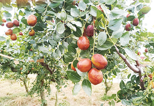 据了解,这片采摘园以前属于荒丘,顶部土层仅有10多公分厚,种粮食不长,却非常适合种植果树。2003年,村民齐术太承包了这片110亩左右的荒丘,除了种植了桃树、樱桃树外,还开辟出35亩建起垛埠岭大枣生态园。“现在适合采摘的是大梨枣,这种枣是专门从陕西杨凌农科院引进的,个头大、皮薄,像梨一样脆、甜,从9月下旬一直可采摘到10月底。”齐术太指着红玛瑙般挂满枝头的大梨枣高兴地说,今年,他果园里的大梨枣正品果亩产量2000余斤,亩收入达到2万余元。