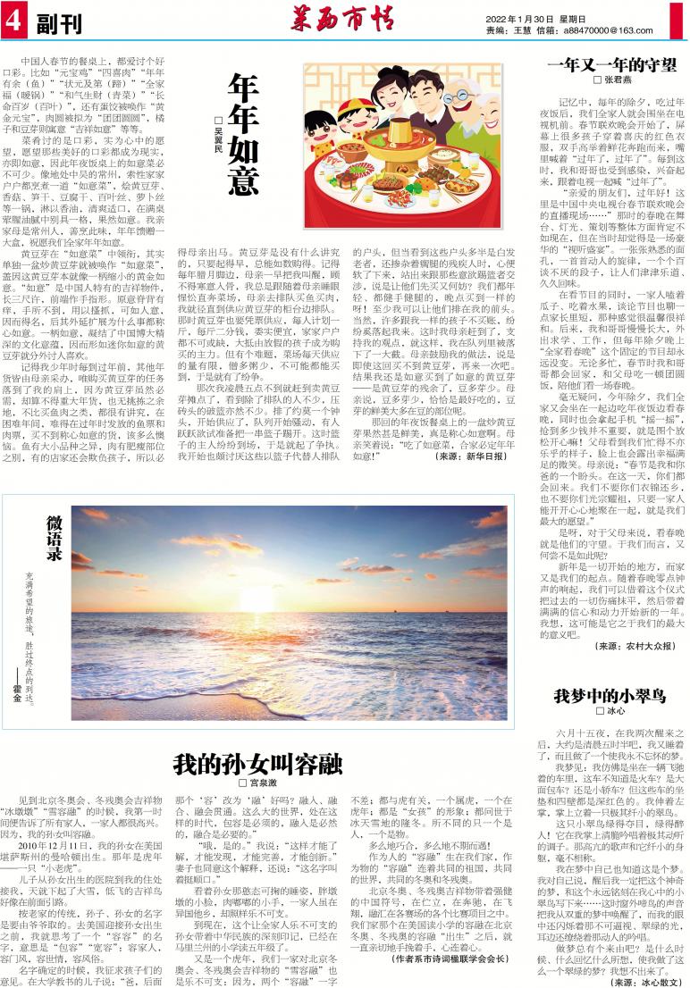 那回的年夜饭餐桌上的一盘炒黄豆芽果然甚是鲜美,真是称心如意啊。母亲笑着说:“吃了如意菜,合家必定年年如意!”(来源:新华日报)