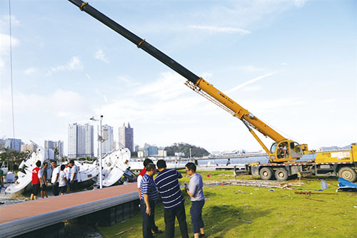 珠海金湾码头,游艇和码头浮桥被台风巨浪打上岸。据码头负责人介绍,游艇和码头设施均已投保,等台风结束后,保险公司将查勘理赔。