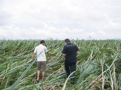 台山市海宴海侨农场南丰村约5000亩甘蔗受台风影响倒伏。阳光农业相互保险广东分公司紧急赶往现场查勘定损。