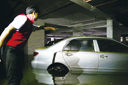 人保财险珠海市分公司的理赔查勘人员到某小区地下车库,打着手电筒查看车辆泡水情况。