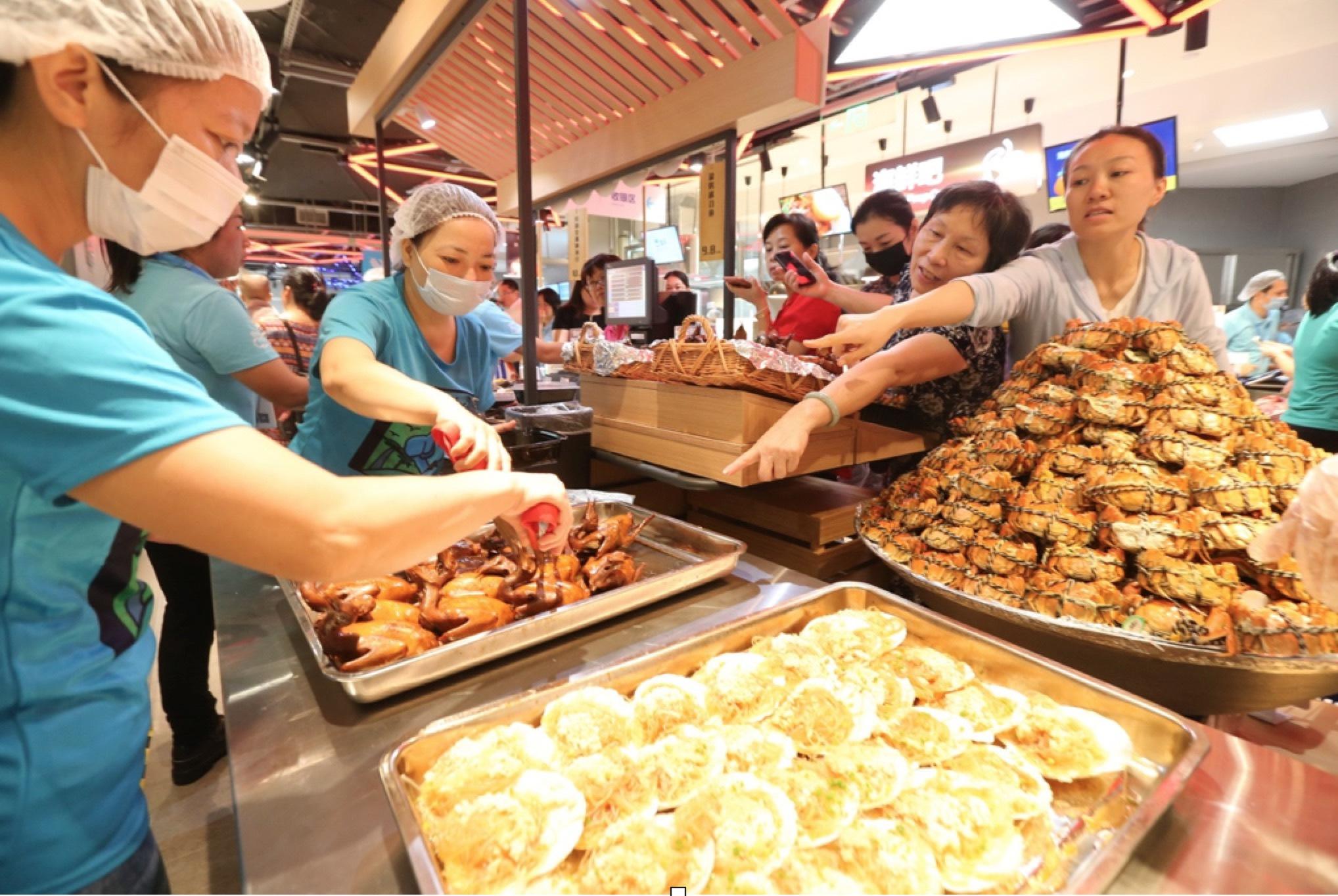”青岛富熙华食品有限公司总经理仇平一边招呼工人为老人送上饽饽…