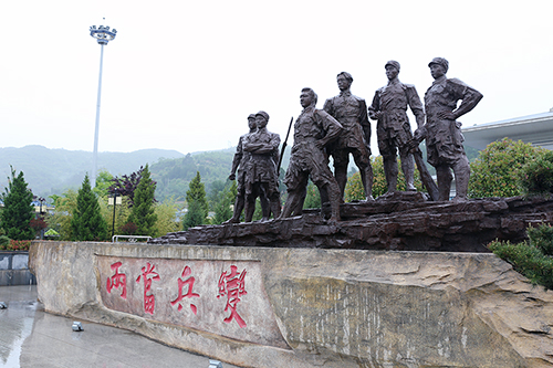 两当兵变纪念馆位于广香东路,是两当兵变部队的集结地。位于两当兵变纪念馆广场南北两侧的大型浮雕墙呈折尺状,正面长13.65米,浮雕墙高4.4米。南北两组在一条平行线上,结构对称,展现了当年习仲勋等热血青年为理想从戎救国,在艰苦卓绝的环境里机智勇敢,积极发展党员、秘密发动兵变的一系列惊人壮举。