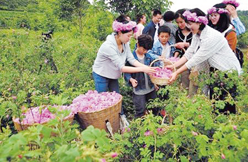 两当县优越的气候资源、丰富的自然资源条件,使玫瑰产业也有了一定的发展,玫瑰系列产品也成为市场上各类人群的需求。目前,全县发展玫瑰品种有千叶玫瑰和大马士革玫瑰两个品种,发展玫瑰种植面积 3300亩,年采收玫瑰花 600吨,总产值 2500 多万元。从事玫瑰生产企业有:两当县绿野天然香料开发有限公司,注册商标为“绿野香苑”,主要开发的产品有玫瑰精油系列、饱和醇露系列、玫瑰面膜、玫瑰酱、玫瑰茶等产品;两当县沁香怡玫瑰生物科技有限公司,注册商标为“西地锦”,主要开发的产品有玫瑰精油、饱和醇露系列产品。