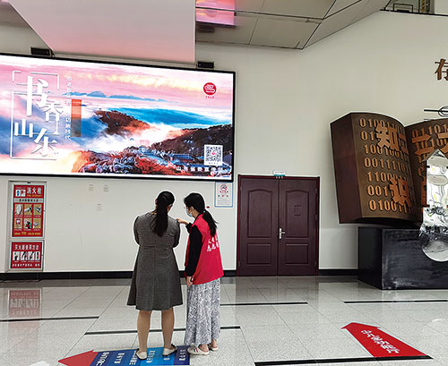 “书香山东·数字阅读”共享工程LED大屏幕播放宣传海报,工作人员指导群众扫码使用“书香山东”小程序。