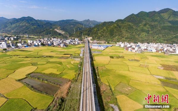 10月4日,一列动车行驶在贵广高铁贵州省榕江县郊外田野高架桥上。正值贵州省榕江县车江大坝的晚熟水稻进入成熟期,从空中俯瞰,色彩斑斓的稻田,犹如秋天绘制的“调色…