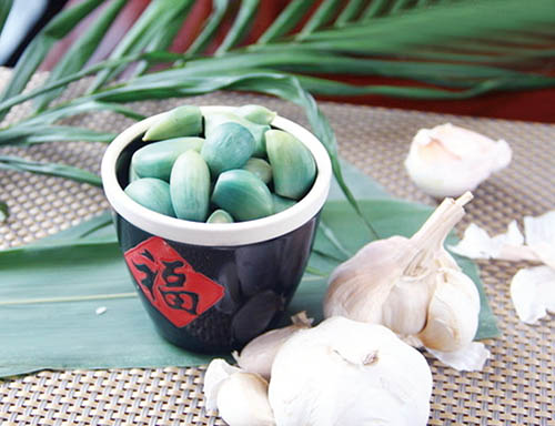 2.腊八蒜。腊八蒜就是在阴历腊月初八的这天来泡制蒜,是北方,尤其是华北地区的一个习俗。其实材料非常简单,就是醋和大蒜瓣儿。做法也是极其简单,将剥了皮的蒜瓣儿放到一个可以密封的罐子,瓶子之类的容器里面,然后倒入醋,封上口放到一个冷的地方。慢慢地,泡在醋中的蒜就会变绿,最后会变得通体碧绿的,如同翡翠碧玉。