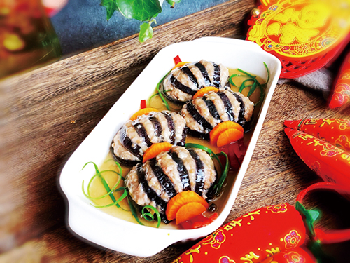主料:茄子1根、猪肉泥200克、胡萝卜、红辣椒; 辅料:盐、料酒、生抽、白胡椒粉、姜汁、鸡粉、蒸鱼豉油、淀粉、葱; 做法: 1、猪肉泥放入盆中,加入料酒、盐…