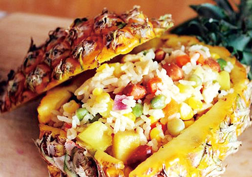 1.将菠萝直立,从菠萝的1/3处切开,不要破坏菠萝头部,留下的2/3段做容器,轻轻地将菠萝果肉挖出,并用淡盐水浸泡15分钟后切成小丁备用。 2.洋葱切成丁,朝天椒切圈…