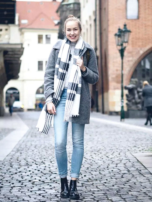 黑、白色围巾几乎是围巾中的基本款,因为它经典又百搭,基本所以颜色的大衣搭配起来都不会出错。