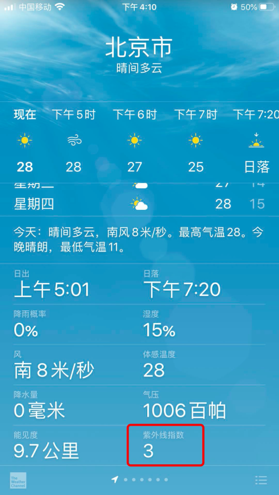 我们在天气预报中经常看到的紫外线指数,是指那一天中当太阳处于天空中最高点时实际紫外线辐射的强度,通常这发生在太阳正午的前后四个小时中。公共卫生组织建议人们在紫外线指数大于或等于3级时要采取措施保护自己(例如可以在皮肤上涂抹防晒霜或打遮阳伞等)。