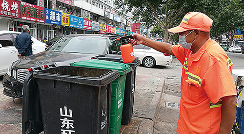 记者在威海中路看到,环卫工人正在对垃圾桶进行喷洒消毒。…