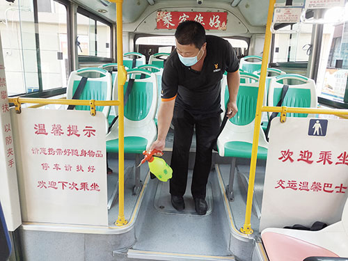 记者在汽车总站停车场看到,公交车驾驶员正在车厢内部进行消毒。…