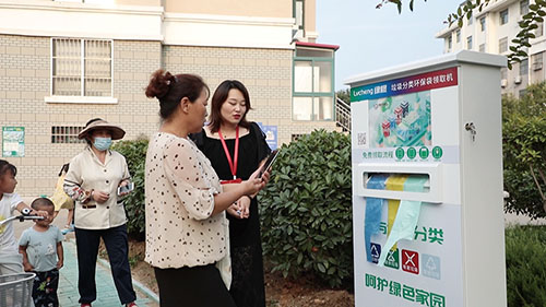 在龙水社区服务中心洙河花园小区设置青岛首台垃圾分类环保袋免费领取机,为居民免费发放垃圾袋,用于家庭分类收集。…